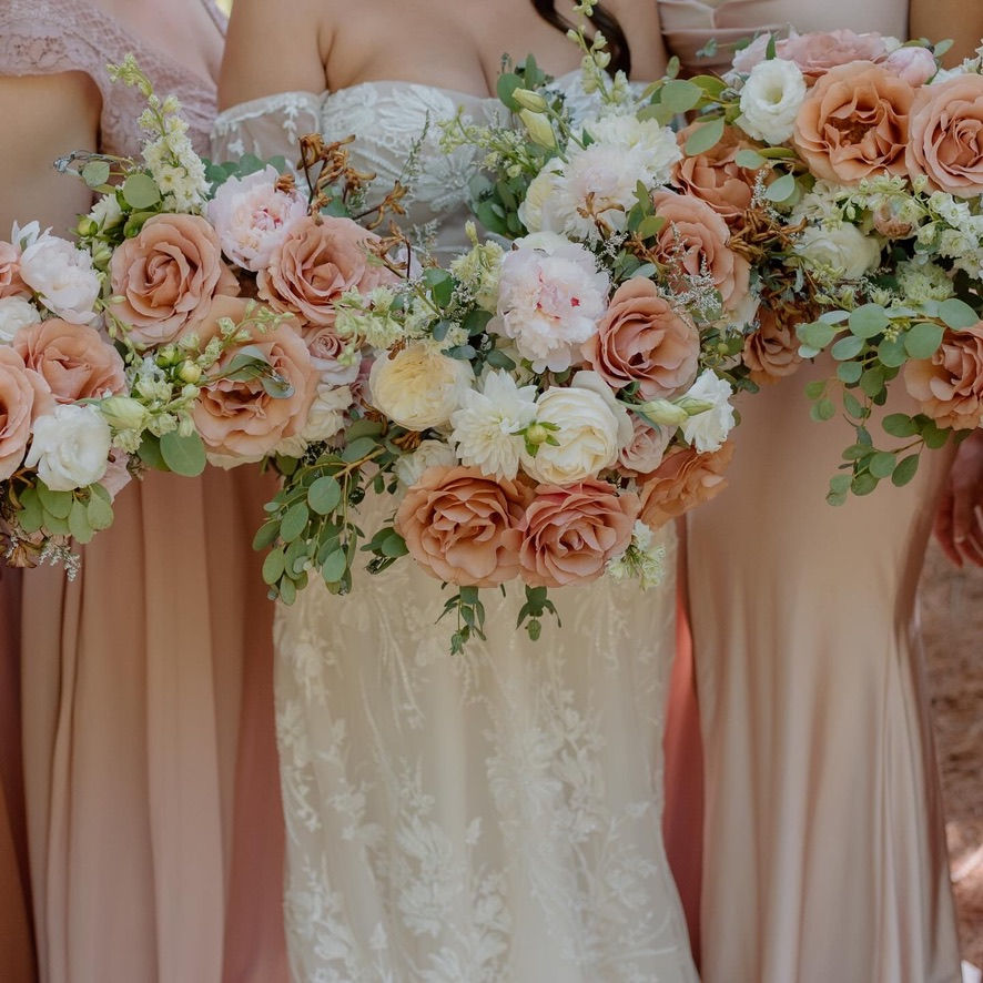 Beautiful and delicate bridal bouquets featuring peach, white, and pink flowers. The bouquets are held by bridesmaids and are perfect for weddings and special occasions.